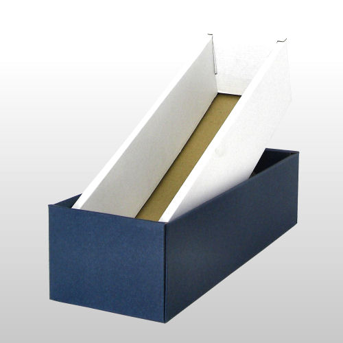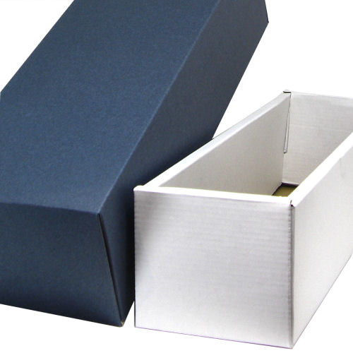 | 色合い | 紺色と白色のシックな色合いで、上蓋と下箱の2ピース合わせ箱です。 |